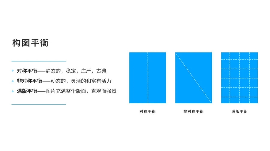 非對(duì)稱(chēng)在不對(duì)等的元素間創(chuàng)設(shè)出秩序和平衡,非對(duì)稱(chēng)設(shè)計(jì)由于版式不可預(yù)見(jiàn),所以空間是變化的。特點(diǎn)是動(dòng)態(tài)的,靈活的和富有活力。非對(duì)稱(chēng)構(gòu)圖比較多,常見(jiàn)的有以下6種形式。